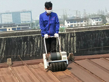 2、先用除銹機(jī)器或手動(dòng)磨光機(jī)對(duì)生銹區(qū)域進(jìn)行打磨,再用風(fēng)機(jī)清理屋面,清掃干凈;